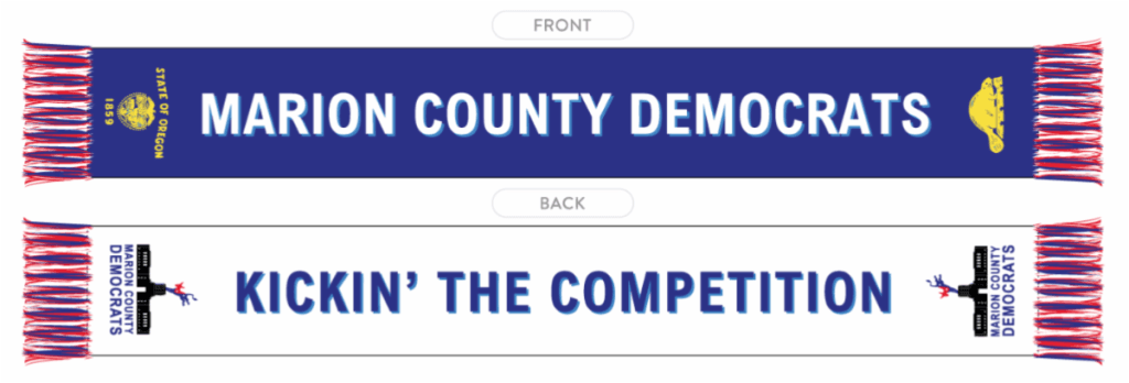 Contribute $50 and reserve your limited edition Marion County Democrats soccer-style knit sports scarf, design pictured below. Contribute $100 to reserve two scarves! Scarves will be available for pickup in late January. And it doesn’t have to cost you a thing, with Oregon’s Political Tax Credit!